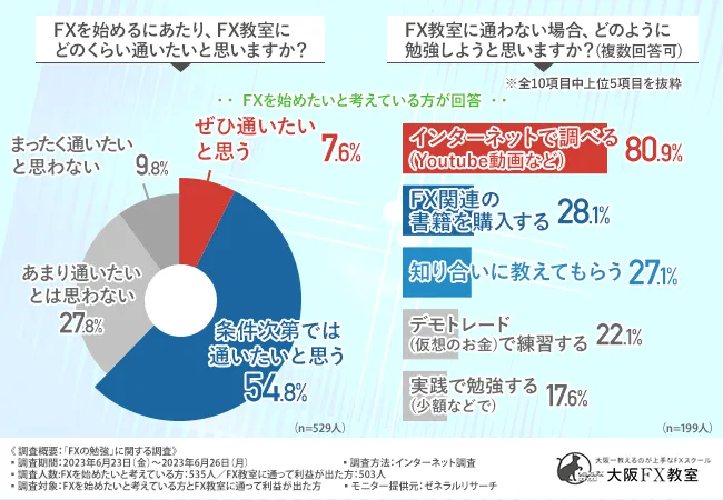 そこで今回、『大阪FX教室』(https://fx.osakaschool.com/)では、FXを始めたいと考えている方とFX教室に通って利益が出た方を対象に、「FX(外国為替証拠金取引)」に関する調査を実施しました。