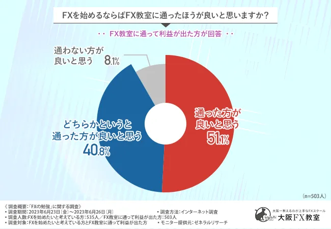 今回の調査で、実際にFX教室に通って利益を出した方の9割以上が、FXを始めるならばFX教室に通った方が良いと感じていることが明らかになりました。