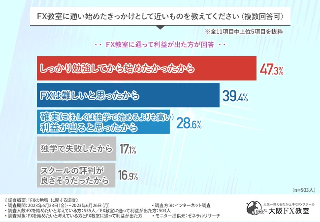 「FX教室に通い始めたきっかけとして近いものを教えてください(複数回答可)」と質問したところ、『しっかり勉強してから始めたかったから(47.3%)』と回答した方が最も多く、次いで『FXは難しいと思ったから(39.4%)』『確実に(もしくは独学で始めるよりも高い)利益が出ると思ったから(28.6%)』『独学で失敗したから(17.1%)』『スクールの評判が良さそうだったから(16.9%)』と続きました。