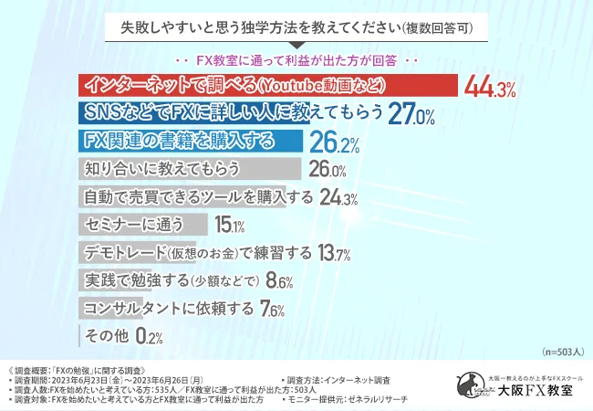 また、FX教室に通って利益がでた方の半数近くが、インターネットで調べる独学方法は失敗しやすいと回答しています。