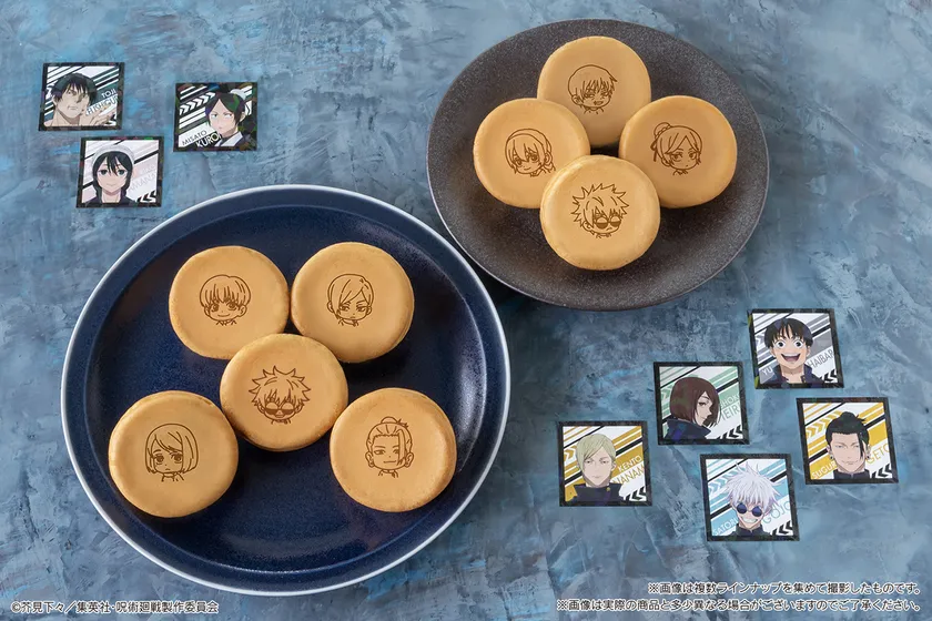 まんまる生地の今川焼きの表面に「呪術廻戦 懐玉・玉折」に登場するキャラクターたちのSD(スーパーデフォルメ)デザインの焼き印(全9種)が押されており、中にカスタード味のクリームが入っているスイーツです。キラキラ輝くホロニス加工のスクエアシールは“五条悟”や“夏油傑”のデザインをはじめとする全8種の中からランダムで1枚が付属します。焼き印、シールともにTVアニメ第2期の最新デザインとなっており、アニメ放送とともに楽しめる商品です。