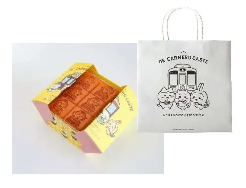 ちいかわ、ハチワレ、うさぎが阪急電車に乗った焼印入りカステラをコラボオリジナル仕様のパッケージとショッパーに入れて販売します。