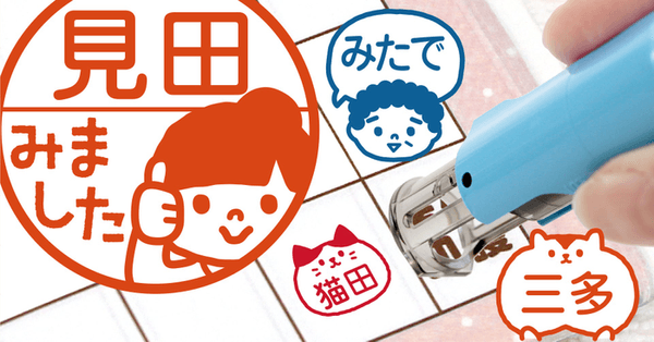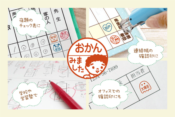 2024年1月に新しいデザインを追加した「みましたスタンプ」。お子さまの連絡帳や音読カードのサイン、塾や学校の先生が提出物に押す確認印に使える、かわいいイラスト入り印鑑です。回覧板のサインやオフィスでのチェック印などにもオススメです。