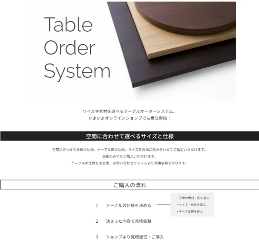テーブルの天板サイズ・素材・カラー、脚の仕様をお好みに合わせて選択できるテーブルオーダーシステムです。用途や空間のテイストに応じて細やかなオーダーに対応いたします。