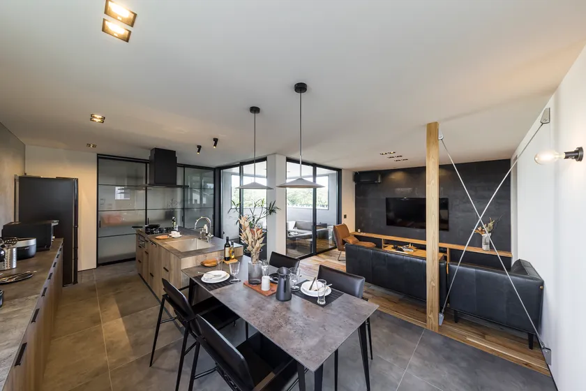 GLAMP最大の特徴は、見学した方々が口を揃えて「実際に見るとその良さに圧倒される」という、2階の開放感です。アウトドアリビング、屋内リビング、ダイニング、キッチンで構成された空間は、大きなガラス窓から視界が抜け、GLAMPの目印である十字窓や、屋根の半分が開いているアウトドアリビングの空へとつながり、想像以上の広がりを感じることができます。