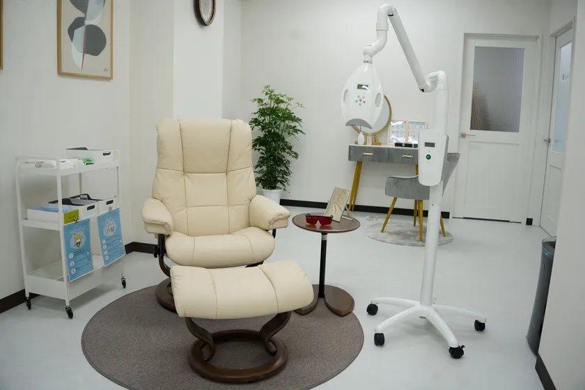 お店の広さは20平米ほど。ゆったり座れるリクライニングソファーがあり、常設されたタブレット、施術に必要な機材が揃っており、初めてでも迷うことなくホワイトニングが実施できます。当店はメディカルホワイトニングなので1回の利用で比較的効果が実感できます。1回あたり15分を2セット行い、月に2回通って2か月~3か月程度で理想の白さに到達するケースが多いです。