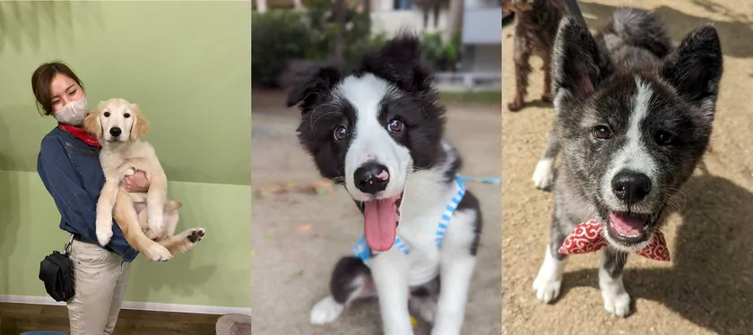 ゴールデンレトリバー「エルモ」ちゃん(左)、ボーダーコリー「ホームズ」くん(中)、秋田犬「ハチ」ちゃん(右)