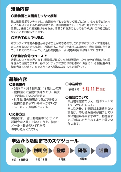 希望者は、「徳山動物園ボランティア説明会申込書」を記入のうえ、持参・メール・郵送のいずれかでお申込みください。