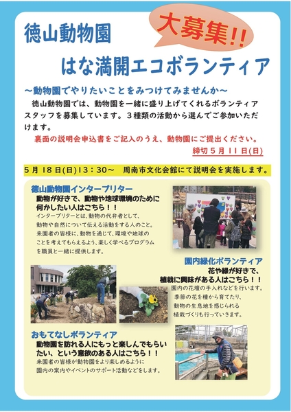 【山口県周南市】徳山動物園 はな満開エコボランティア募集!