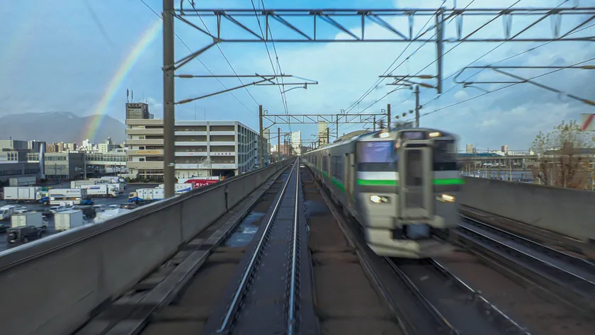 苗穂運転所を出発したノースレインボーエクスプレスは、札幌まで回送で運転。札幌入線後、満員の乗客を乗せ函館本線を進む。協調運転の731系・キハ201系などとすれ違い、車窓の石狩湾を眺め港町・小樽に到着する。小樽から長万部までの函館本線は、山線でも親しまれる単線の非電化区間。しかし、北海道新幹線の延伸に伴う経営分離により廃止が決定している。激しい雨の中、余市・倶知安では沿線の人々から温かい歓迎を受け、ニセコでは駅近くの鉄道遺産群を横目に曲線や橋梁・勾配が続く山間部を力強く駆け抜ける。次第に天候が回復すると列車は室蘭本線と接続する長万部に到着し長時間の停車を迎える。その後、特急北斗とすれ違いながら噴火湾が広がる海岸線を走行。森で砂原支線、大沼で藤城支線と分かれ、やがて新函館北斗で北海道新幹線と合流する。列車は5時間30分を超える長い旅の果てに函館へ到着する。