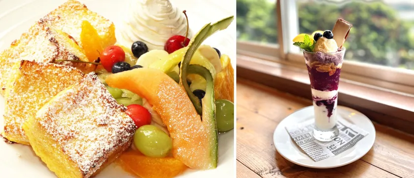 (左)フルーツの彩りが映えるフレンチトースト (右)ブルーベリーと赤紫蘇の農家パフェは夏季限定!