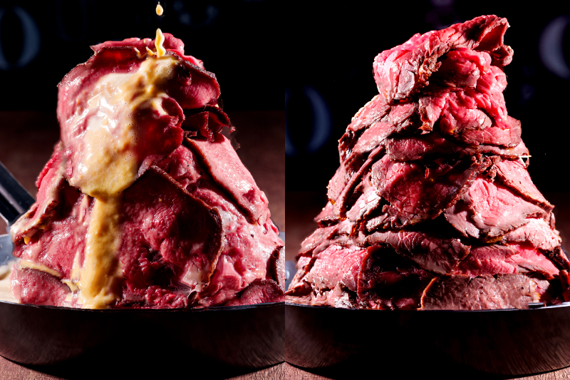 もうひとつの「特盛ローストビーフ丼」は、1kgのローストビーフをご飯2kgにのせた総重量3kgの丼ぶりです。トッピングするローストビーフは、当店で人気のメニューで、柔らかな食感と肉の旨みが感じられる自慢の逸品。濃厚なオリジナルソースもおいしさの秘訣です。
