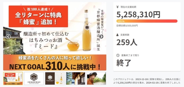 株式会社金市商店(本社:京都市中京区三条通富小路西入中之町21)は、クラウドファンディングサイト「CAMPFIRE」にて実施していた「京都蜂蜜酒醸造所」で初醸造される蜂蜜酒の先行予約販売を、2024年2月19日に目標達成率1051%で終了しました。ご支援及び応援してくださった多くの皆様に心より御礼申し上げます。