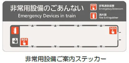 お客さまにより安全にご利用いただくため、車両のリニューアル工事に併せて安全設備の設置も進めてまいります。車内の緊急時に乗務員と通話ができる装置(非常通話装置)については、1両につき1台から2台へ増設し、設置位置をわかりやすくご案内するため、側扉横に非常用設備ご案内ステッカーを貼り付けます。また、車両を連結して運用する際に、連結部からの線路への転落防止のため、車両の先頭部に転落防止ほろを取り付けます。