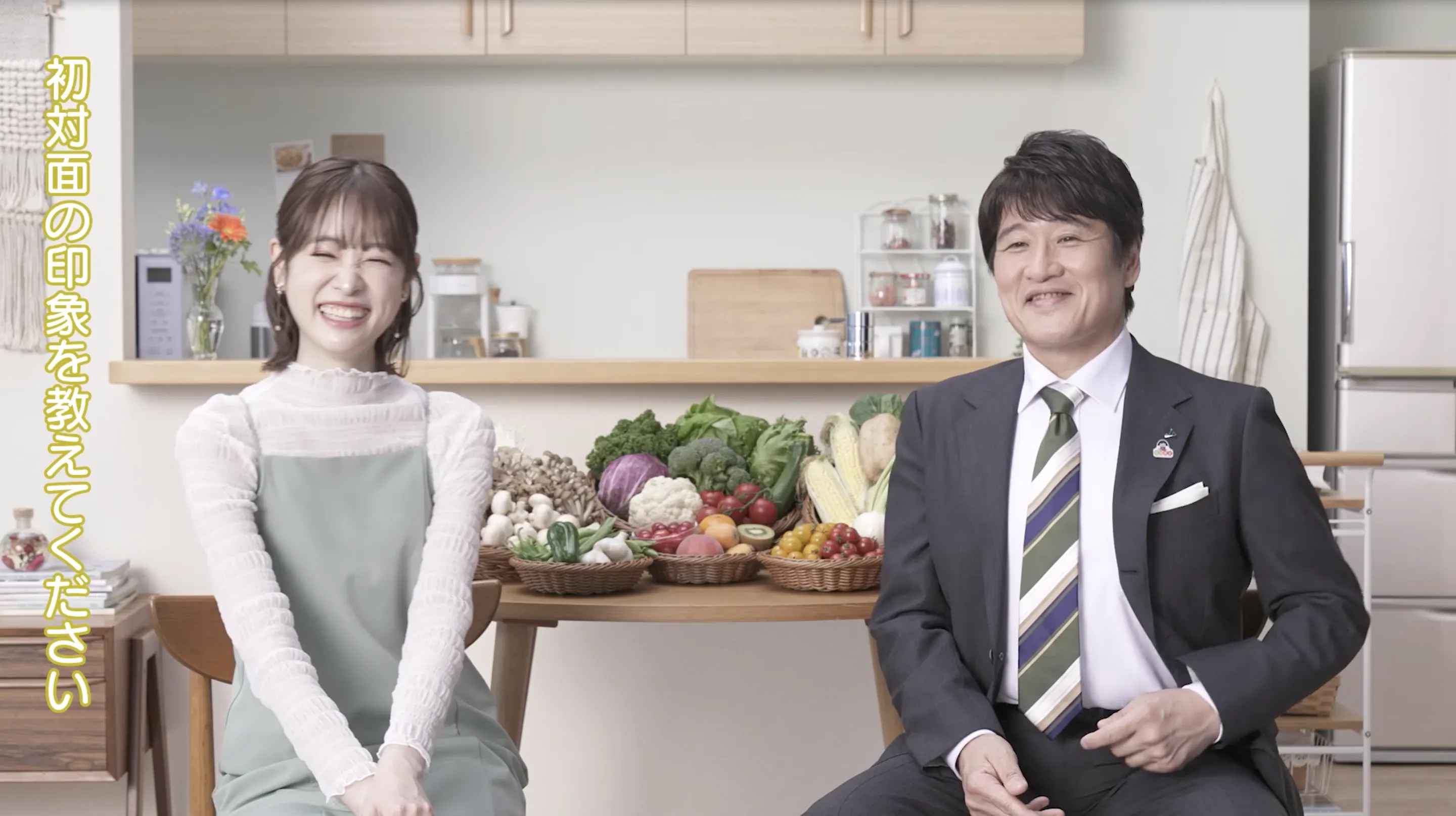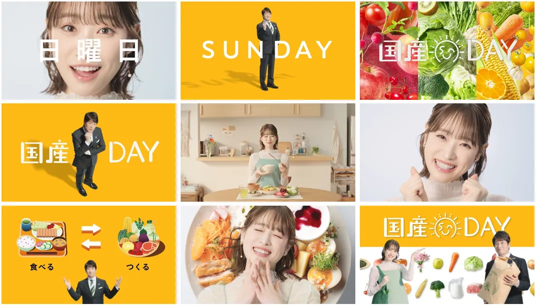 カメラに向かって「日曜日といえば?」と問いかける高橋さん。「SUNDAYですね!」と答える林先生に、「いいえ、“国産DAY”です!」と明るく返すと、舞台はスーパーに早変わり。カートを押しながら食材を手に取り歩いていく高橋さんは「新鮮でおいしい国産の食材を、食卓にもーっと取り入れて元気を蓄えちゃおう!って日です!」と解説。感心した様子の林先生は、「私たちは食べることで、この国の農業も守っていけるんですよ」と続けます。最後にはお二人が元気に「はじめよう、国産DAY!」と呼びかけます。全国の食卓に笑顔を届けるCMになっています。