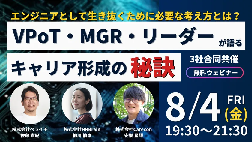 システム開発事業やエンジニア教育カリキュラム「Code Strategy」を運営する株式会社Carecon(キャリコン、本社:東京都渋谷区、代表取締役:大庭 意史、以下「当社」)は、2023年8月4日(金)19時30分より株式会社HRBrainと株式会社ペライチとの3社合同共催セミナー「VPoT・MGR・リーダーが語る、エンジニアキャリア形成の秘訣」を開催します。