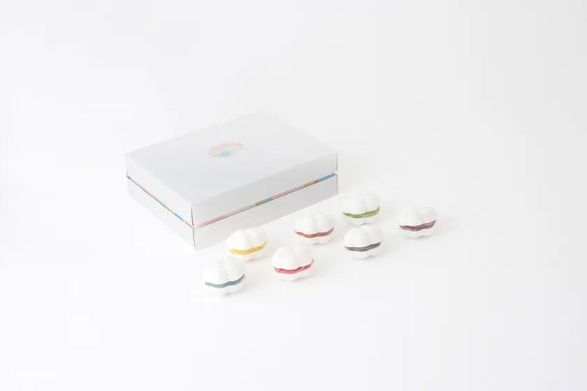 雲もなかは、大切な人への想いを空へ届ける、新しい弔いのカタチです。箱を開けると、雲のカタチをしたころんとかわいいもなか皮が7つ入っています。そのほか、もなかを作るための道具は全て揃っています。