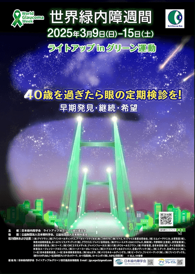 「ライトアップinグリーン運動」は、緑内障の認知と啓発に向けて、各地のランドマークや医療施設等をグリーンにライトアップする日本緑内障学会が主催する運動です。2015年に日本全国5か所で開始されましたが、年を重ねるごとに運動の輪は大きく拡がり、2024年には海外を含む計1501カ所で実施されました。