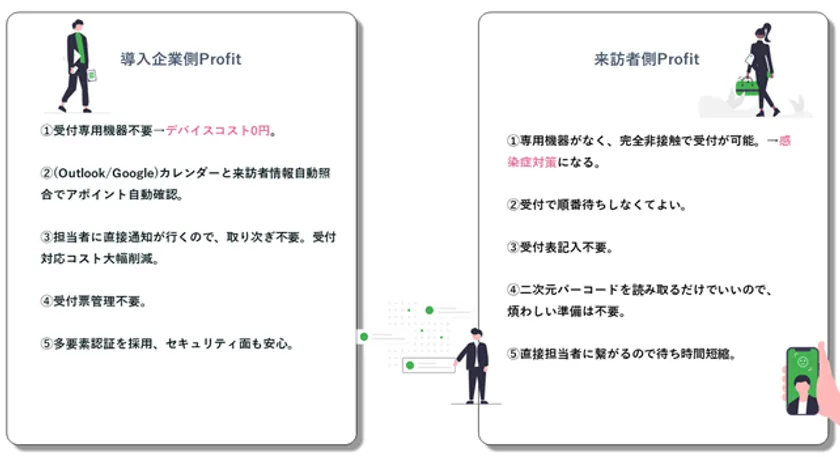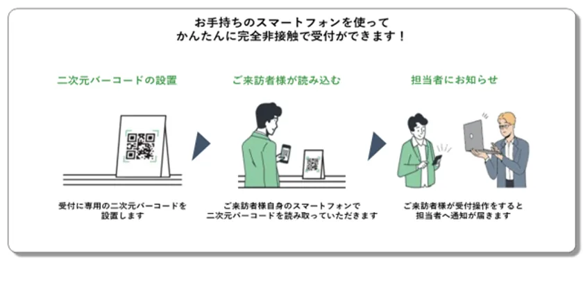 来訪者はスマートフォンで受付に設置された二次元バーコードを読み取り、初回来訪だけ「会社名」、「氏名」を入力し、訪問先担当者を選択すると、担当者に直接通知が届くため、取次も不要になります。2回目以降の来訪では、来訪者情報の入力は不要となります。また、受付機器を必要としないため、感染症対策に繋がり、スマートな受付が実現します。