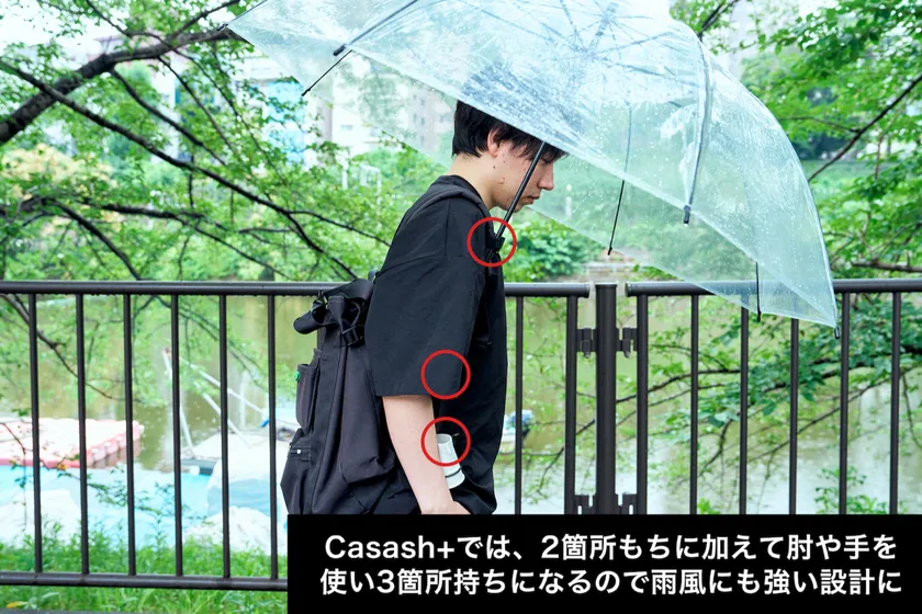 暴風雨時の傘の持ち方として、傘の取っ手や柄の部分2か所持ちをする事で、傘を暴風雨にたいして安定させようとします。Casash+を使用する事により同様な持ち方になります。