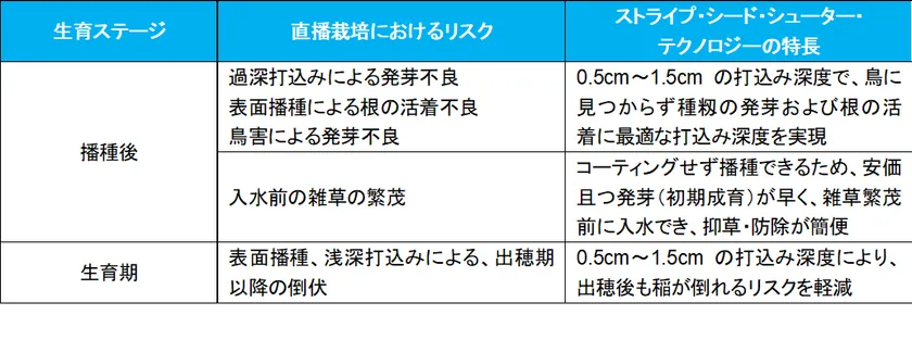 表2.直播栽培におけるリスクと、「ストライプ・シード・シューター・テクノロジー」の特長