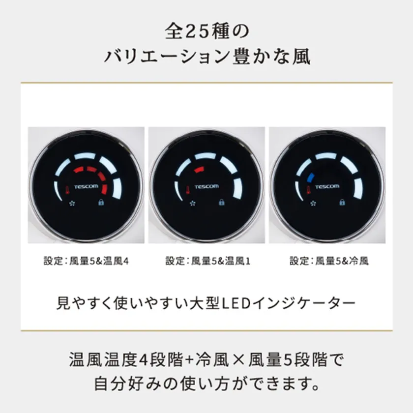 温風温度4段階+冷風×風量5段階のモードにより、ニーズに合わせた風の使い分けが可能に。