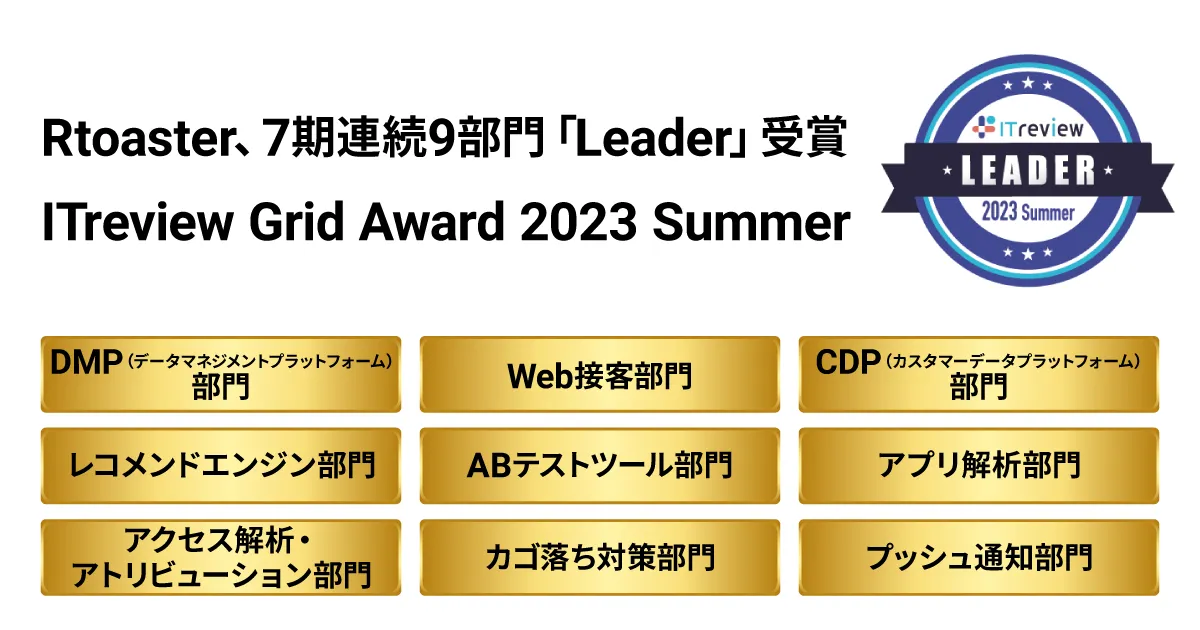 「ITreview Grid Award」の「Leader」は、顧客満足度と認知度の双方に優れ、ユーザーから高い評価を得ているプロダクトに与えられるもので、「Rtoaster」は「DMP(データマネジメントプラットフォーム)部門」、「CDP(カスタマーデータプラットフォーム)部門」、「レコメンドエンジン部門」について、11期連続での受賞となります。
