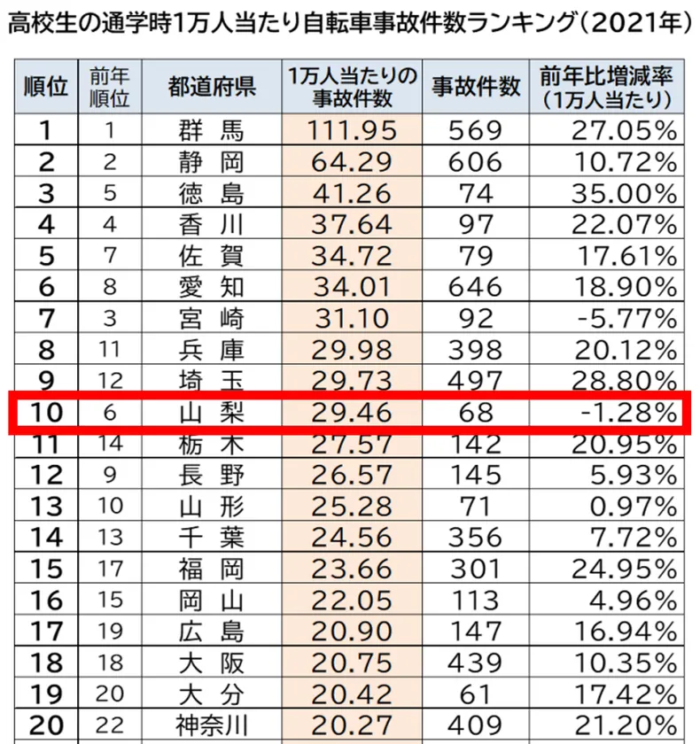≪2021年都道府県別高校生の通学時自転車事故ランキング/山梨県≫