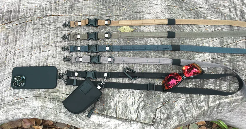 アウトドアシーン、キャンプ、スポーツ、アクティビティでスマホ、財布、サングラス、小物などを手ぶらで携帯するためのマルチストラップです。