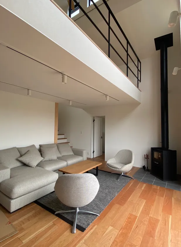 吹き抜けのリビングからは川が見渡せる