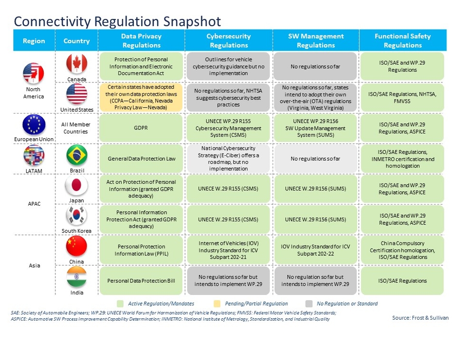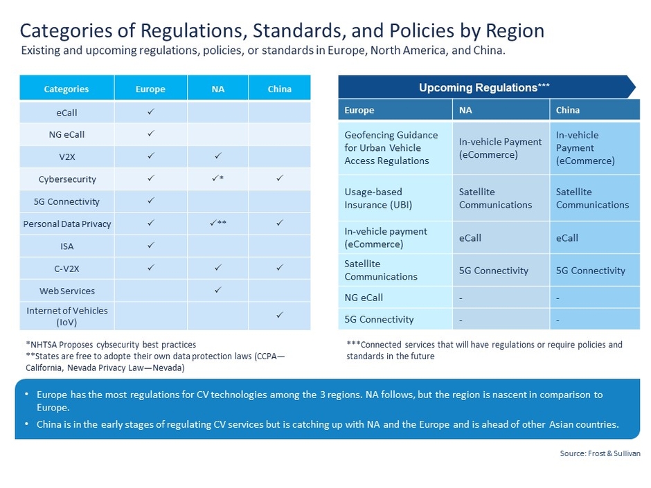 今後、北米と中国では、5Gコネクティビティ、車載決済(eコマース)、衛星通信、eCallが規制されるか、政策や基準が必要とされるコネクテッド・サービスのひとつとなります。欧州では、都市部での車両アクセスのためのジオフェンシング機能、利用ベースの保険(UBI)、NG eCallに関連する先進的な規制が予想されます。