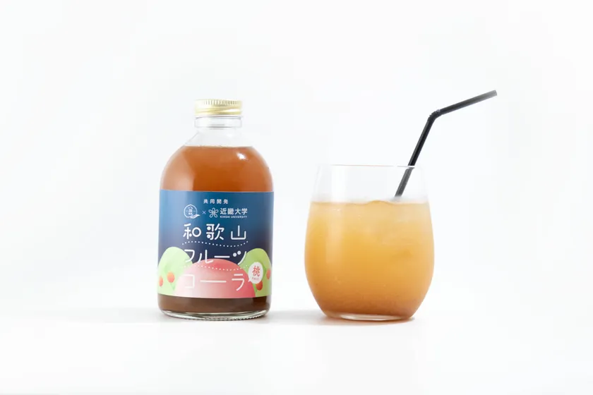 「和歌山フルーツコーラ」は、和歌山県産果実の未利用資源を活用することでSDGsに寄与した健康志向の高いクラフトコーラです。主な原料は、わずかな傷が原因で廃棄される規格外の桃を使用した株式会社八旗農園の「あら川の桃」ピューレや、通常は廃棄される「近大みかん」の乾燥果皮で、未利用資源を積極的に活用し、フードロス解消に貢献するサステナブルな商品となっています。近大みかんの果皮は、近畿大学農学部農業生産科学科の3年生約50人が、農場実習の一環として収穫したものを使用しました。