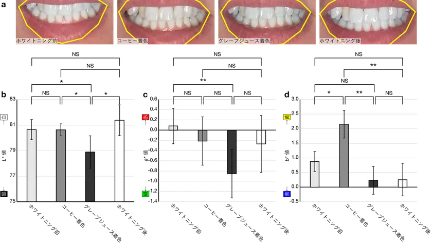図1. アプリで撮影したホワイトニング前後の歯の画像(a)と色の変化(b-d)