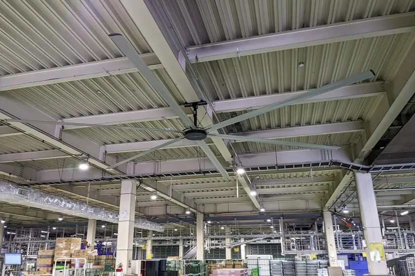 大型シーリングファン『スマイルファン』を倉庫や工場の天井に設置することで、室内の風を動かす気流を作り、作業者に常に心地よい風を送ることができます。体感温度-5℃を実現し、夏場の熱中症対策、環境改善に効果的です。