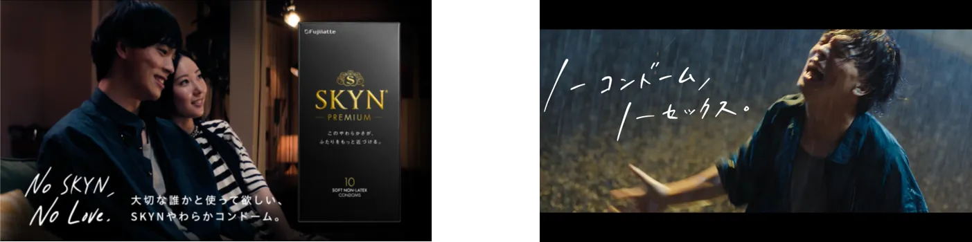 やっとの思いで目的地に到着するもそこには「閉店」の看板が。最後はもしSKYNを常備していたらという設定。「SKYNがなければ、Loveもない」「このやわらかさが、ふたりをひとつにする。」のメッセージ。