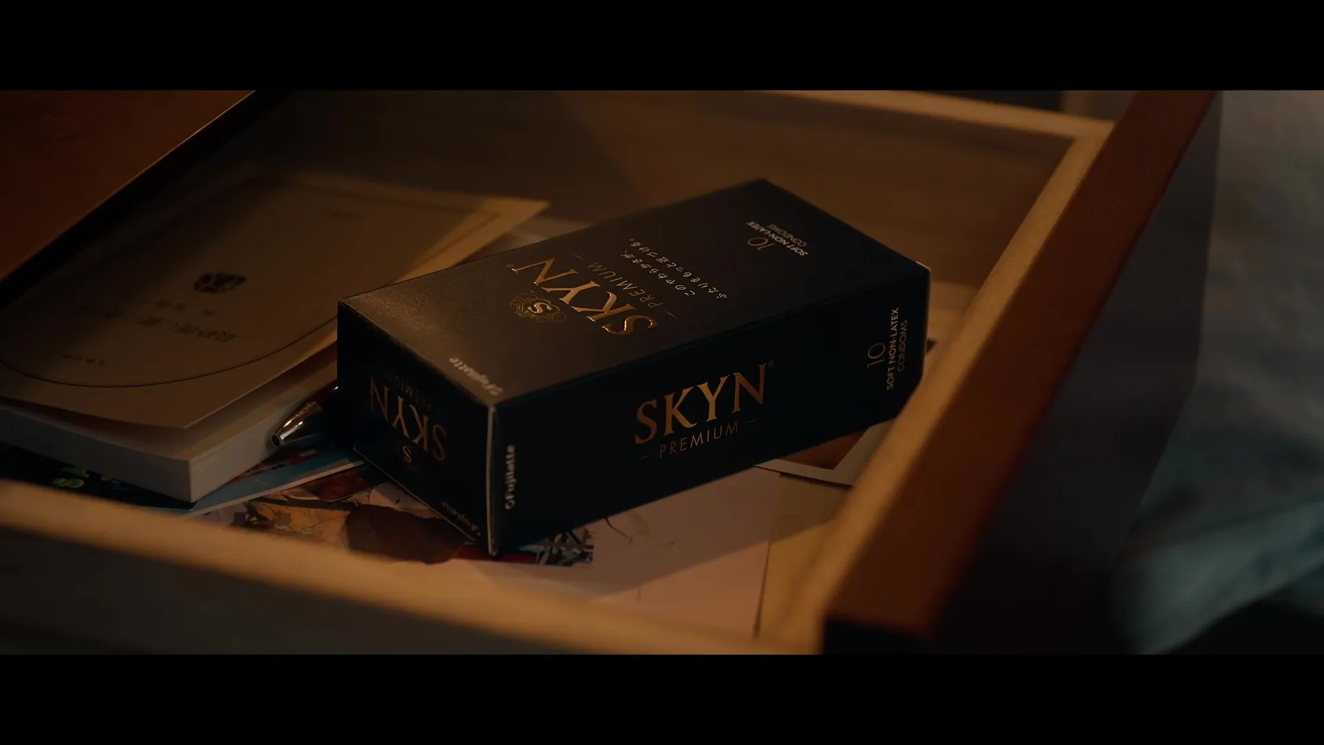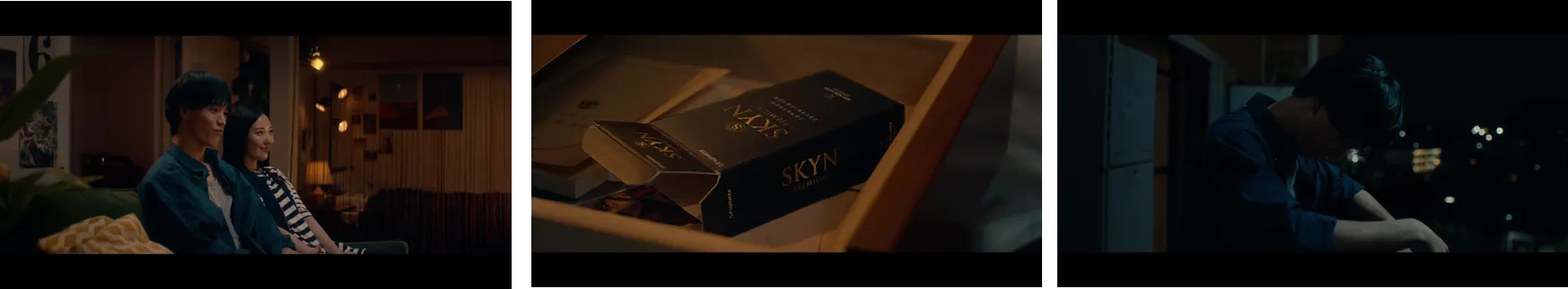 夜に部屋でくつろいでいるカップルが、良い雰囲気になるシーンから動画がスタート。いざその時を迎えるが、SKYN(R)が無いことに気づき、ベランダで肩を落とす主人公の男性。
