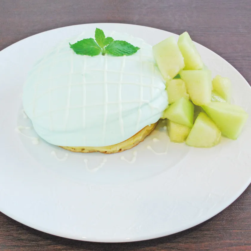 農家だからこそできる素材にこだわったパンケーキを重ねた上に、メロン風味クリームをたっぷり。