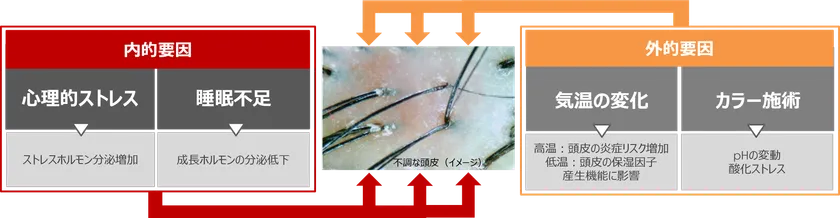 そこで、「頭皮のときどき不調」をまねく様々な内的・外的ストレス要因に着目しました。こうした避けられない日々のストレス(内的要因:心理的ストレス・睡眠不足、外的要因:気温の変化・カラー施術)は、頭皮に備わるバリア機能を低下させ「頭皮のときどき不調」を引き起こします。