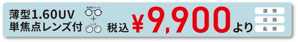 うす型1.60UV単焦点レンズが付いて、メガネ一組 税込¥9,900より、その他豊富にご用意しております。