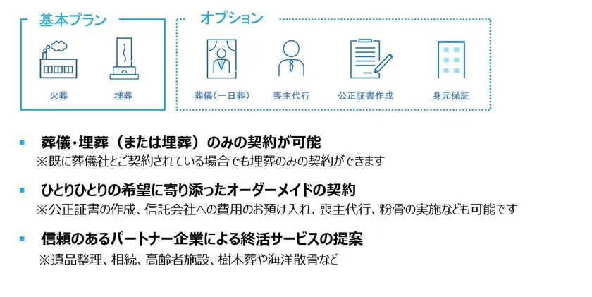 葬儀・埋葬(または埋葬)のみに特化した委任契約です。ひとりひとりの希望に寄り添ったオーダーメイドの契約を実現します。依頼者の希望をかなえるため、一つ一つ丁寧にヒアリングを複数回行い、ご本人さまの中にあるイメージをしっかりと形にいたします。埋葬は、お墓を継ぐ人がいない方のための永代供養やお墓を持たない方のための海洋散骨にも対応し、納骨の最高級ブランド「高野山のご納骨」もご案内しています。