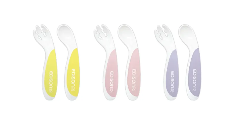 昨年、誕生10周年を迎えたエジソンママのロングセラー商品。フォークは溝がついていて具材が落ちにくく、先が丸くて安心・安全。スプーンは隅々まできれいに食べられる形状で、平らな面がお皿やカップにフィットしてキレイにすくえます。
