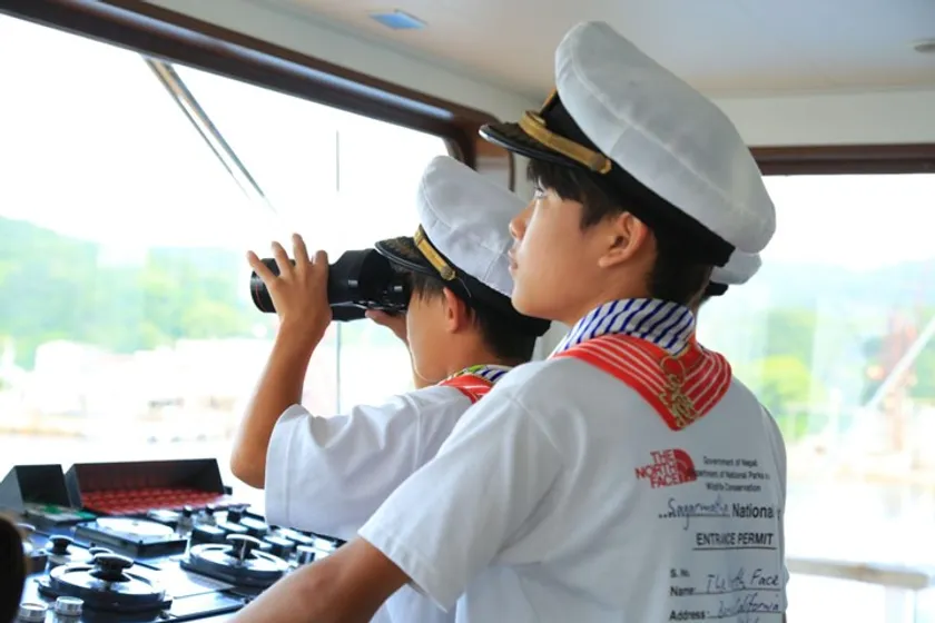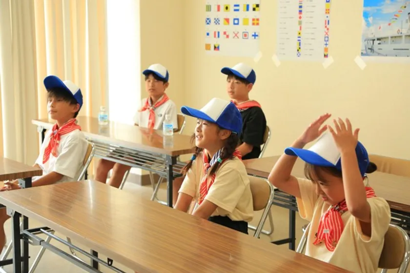 ・操舵室やデッキで双眼鏡や無線通信で安全確認、国際信号旗の掲揚、海図や計器の紹介
