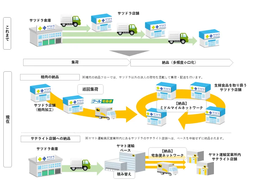 今回、ヤマト運輸の輸配送ネットワークを納品フローの一部で活用することで、生鮮食品を取り扱うサツドラ店舗あての精肉の納品や、サテライト店舗あての納品において、多頻度小ロットでの配送が可能になります。