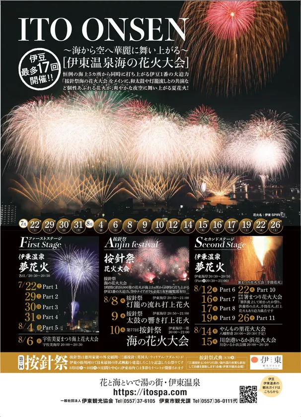 伊東市(庁舎:静岡県伊東市、市長:小野 達也)は、この夏、伊豆最多となる17回の花火大会を令和5年7月22日(土)から8月26日(土)の間に開催します。今年は、最大4夜連続開催となります。