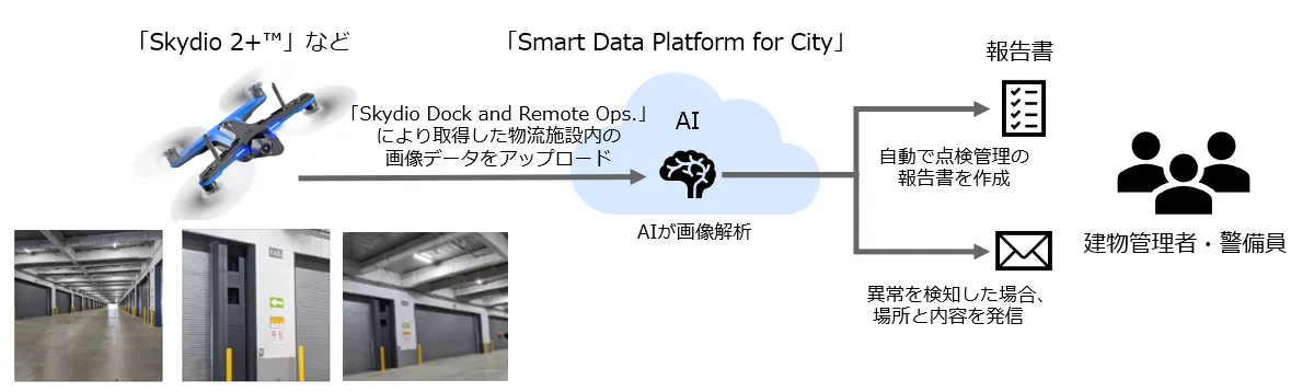 開発するソリューションは、NTT Comが販売するドローン「Skydio 2+(TM)」などを遠隔操縦したり自動巡回を実現するソリューション「Skydio Dock and Remote Ops.」(※3)により取得した物流施設内の画像データを「Smart Data Platform for City」(※4) (以下 「SDPF for City」)へアップロードし、AI(※5)が画像解析することで、設備の損傷や不審物などの異常を検知するもの(以下 本ソリューション)です。異常を検知した場合、建物管理者・警備員に場所と内容を発信するとともに、自動で報告書を作成します。