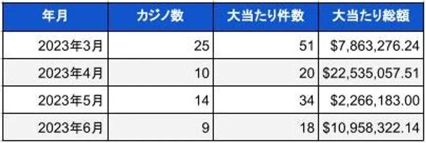 2023年6月は9店舗のカジノでジャックポット当選が18件出ており、当選総額は1098万ドル(日本円で約13億8千万円以上)でした。
