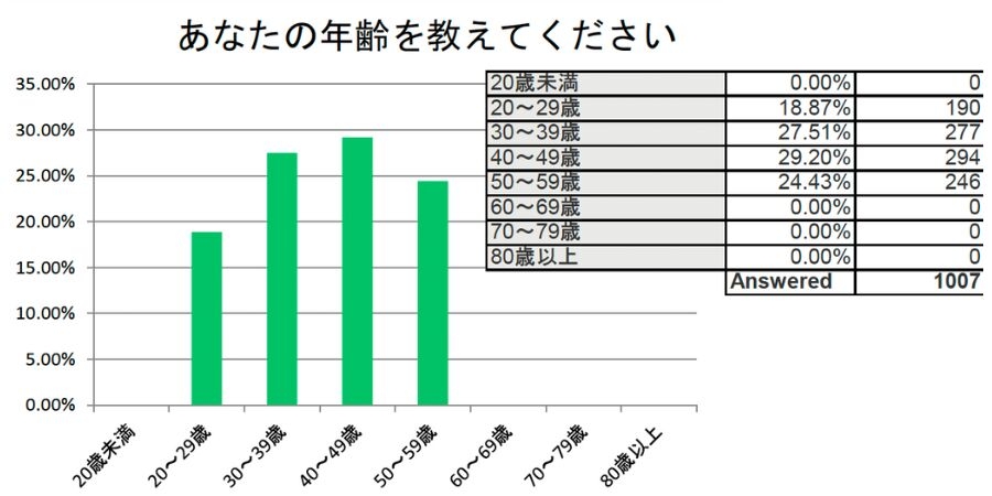 東京都が11.72%(118人)、大阪府が9.83%(99人)、神奈川県が8.44%(85人)、埼玉県が6.65%(67人)、北海道6.26%(63人)、愛知県6.06%(61人)、千葉県5.86%(59人)で全国満遍なくすべての都道府県の1,007人の方にご回答いただきました。