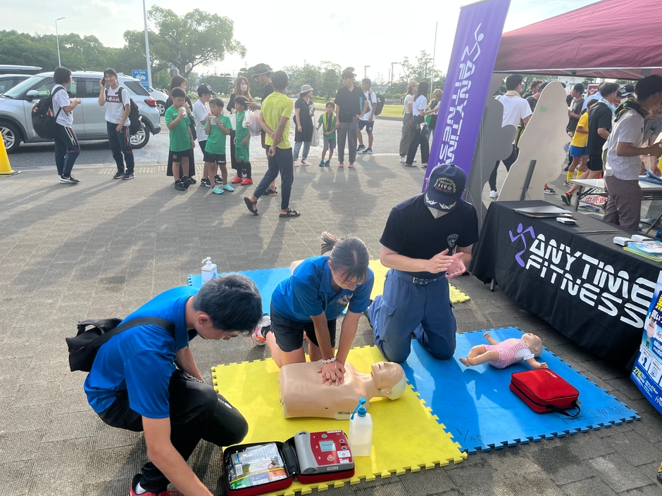 24時間年中無休・マシン特化型のフィットネスジム「ANYTIME FITNESS(エニタイムフィットネス)」は2023年7月9日(日)、紀三井寺公園陸上競技場で開催された、関西サッカーリーグ1部で現在首位の「アルテリーヴォ和歌山」の試合「海南ライフグッズマッチ(6.2 海南水害チャリティー試合)」に南海電気鉄道株式会社と共同でブース出展しました。ブースでは、和歌山市消防局指導のもと、自動体外式除細動器(以下略称:AED)の正しい使い方を指導する「AED講習会」を実施し、ご来場の方、総勢75名にご参加いただきました。
