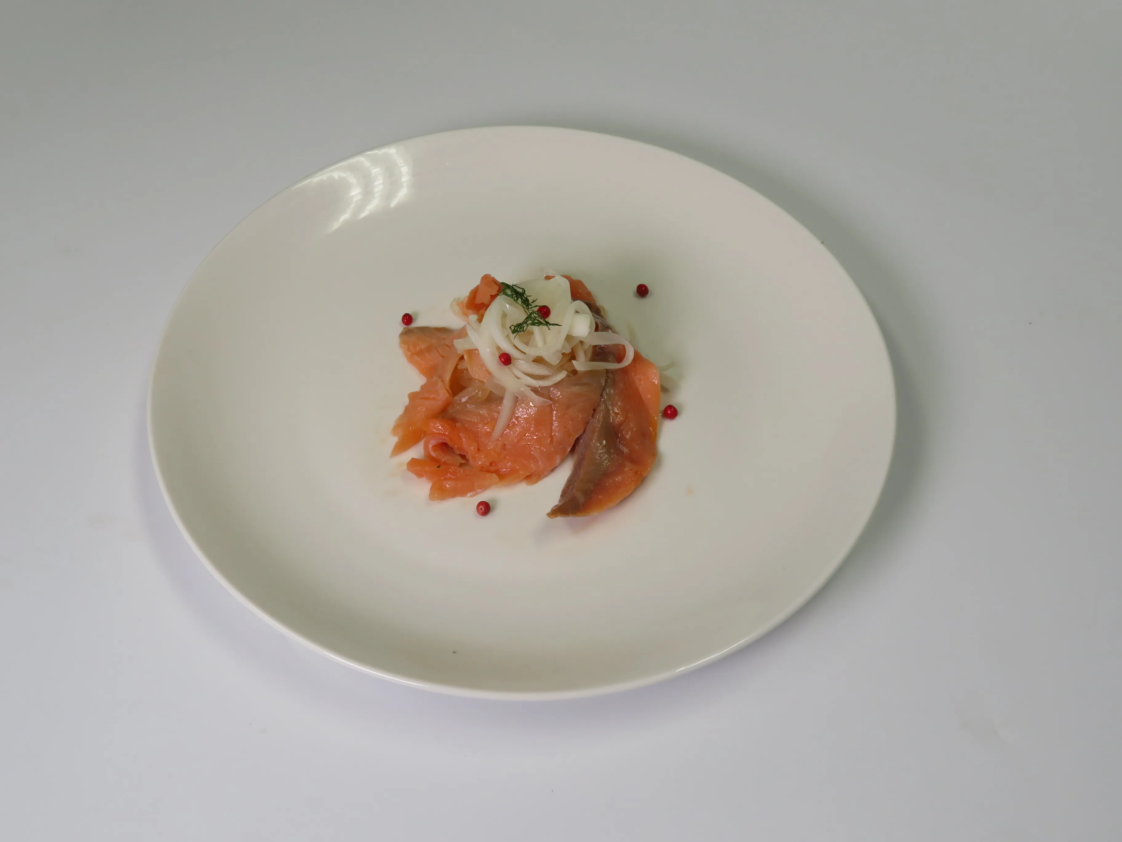 脂ののったサーモンと甘酸っぱい玉葱のマリネにディルの華やかな香りが添えられています。