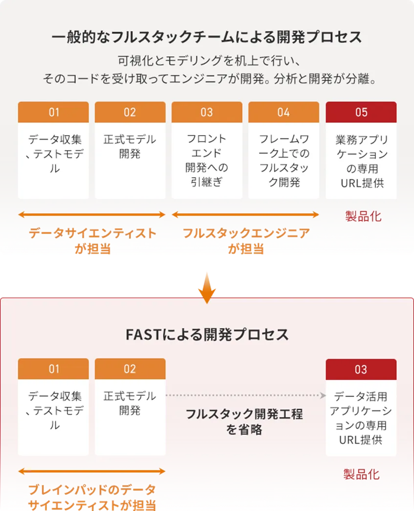「BrainPad FAST」は、最新の技術を用いて開発部分の工数を大幅に削減し、データサイエンティストのチームのみでデータ活用アプリケーション開発までを行う、これまでにない新しい開発プロセスを実現しています。企業ニーズの高い、需要予測、生産計画、配送計画などのアプリケーションを予め用意しており、短期間で現場で利用できるデータ活用アプリケーション開発をブレインパッドが実施します。